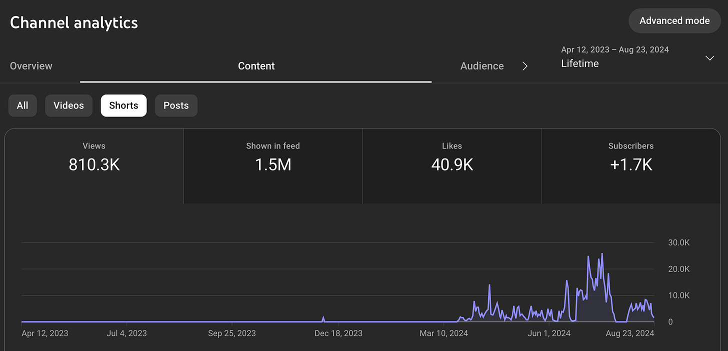 Also with 810.3K Shorts views (which is admittedly few in this TikTok-inspired game), I’ve made a grand total of $116.88 to date. Not mad about it, but it’s not worth the extra work. And while I’ve gained 17% of my subscribers via Shorts, YouTube Analytics show these subscribers rarely watch long-form videos. So there’s no incentive to play that game anymore.