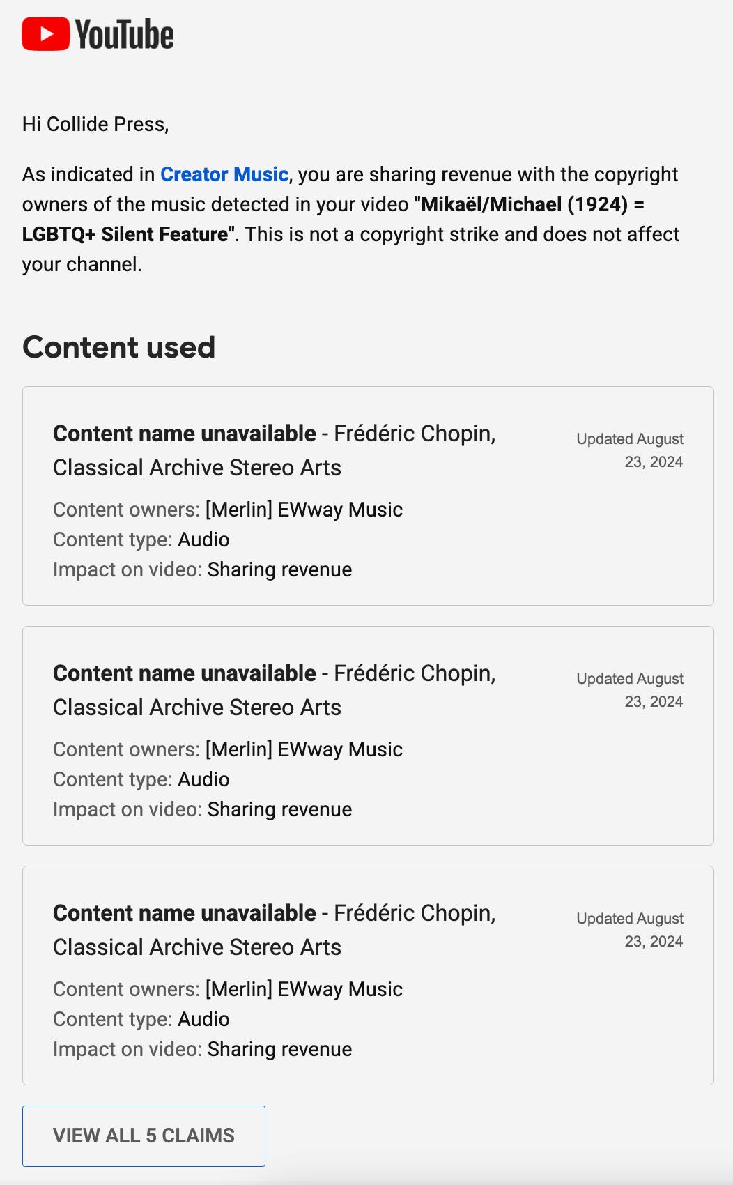 Since returning to the platform on August 2, 2024, I’ve faced countless (and often daily) instances of CopyFraud (aka Content ID abuse and false copyright claims) and “Ad suitability” issues thanks to YouTube’s censorship and copyright bots.