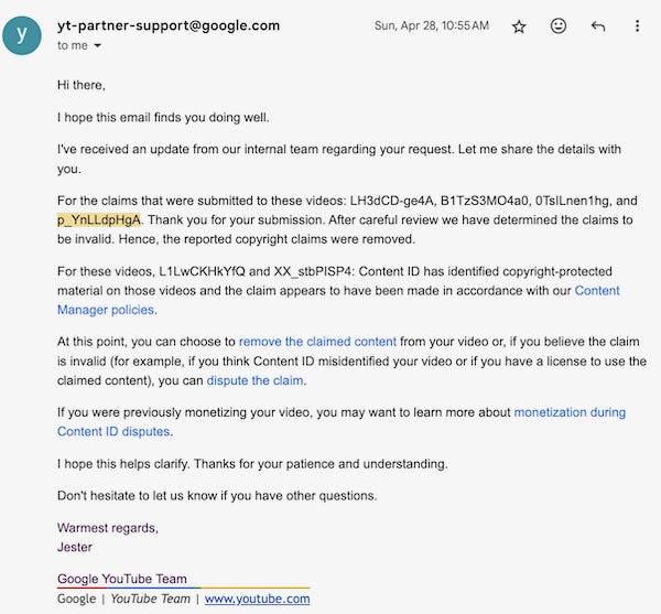 5:25:59 AM Collide Press: From the original YT email: "For the claims that were submitted to these videos: LH3dCD-ge4A, B1TzS3MO4a0, 0TsILnen1hg, and p_YnLLdpHgA. Thank you for your submission. After careful review we have determined the claims to be invalid. Hence, the reported copyright claims were removed."